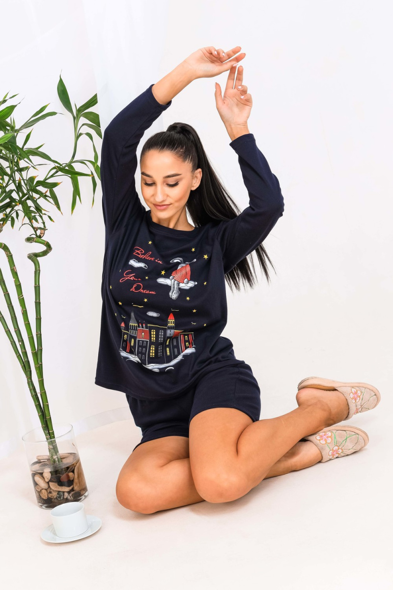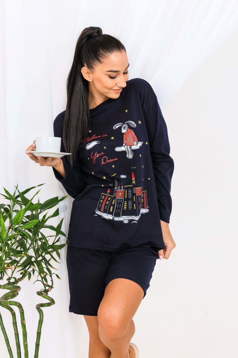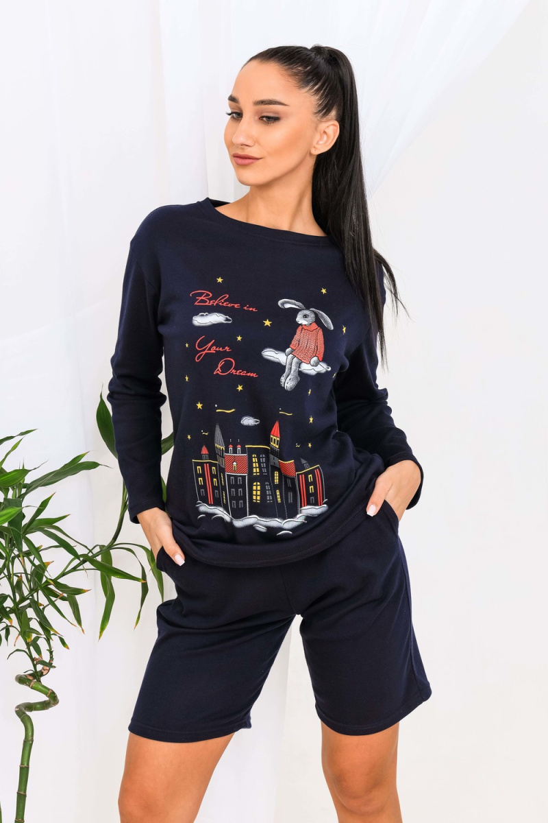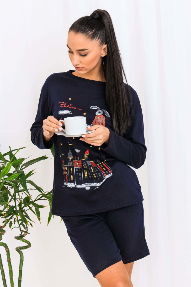 Домашний костюм, состоящий из лонгслива и удлинённых шорт. Костюм изготовлен из ткани высокого качества интерлока пенье. Пенье-это полотно, при производстве которого используют самые лучшие длинные нити. На интерлоке пенье не образовывается затяжек, катышков и прочих неприятностей, эта ткань всегда выглядит безупречно. Мягкий натуральный хлопок гипоаллергенен, не раздражает кожу и позволяет ей дышать. На лонгсливе изображены замок и заяц, которые создадут атмосферу волшебства в вашем доме. Лонгслив свободного кроя, шов на горловине обработан киперной лентой. Особенности кроя шорт: высокая посадка, свободный крой, боковые карманы, пояс прошит на поясной машине. Рекомендации по уходу: бережная стирка до 30 градусов, деликатный отжим, не выкручивать, отбеливание запрещено, гладить со стороны изнанки. Такой костюм вам подарит ощущение сказки.