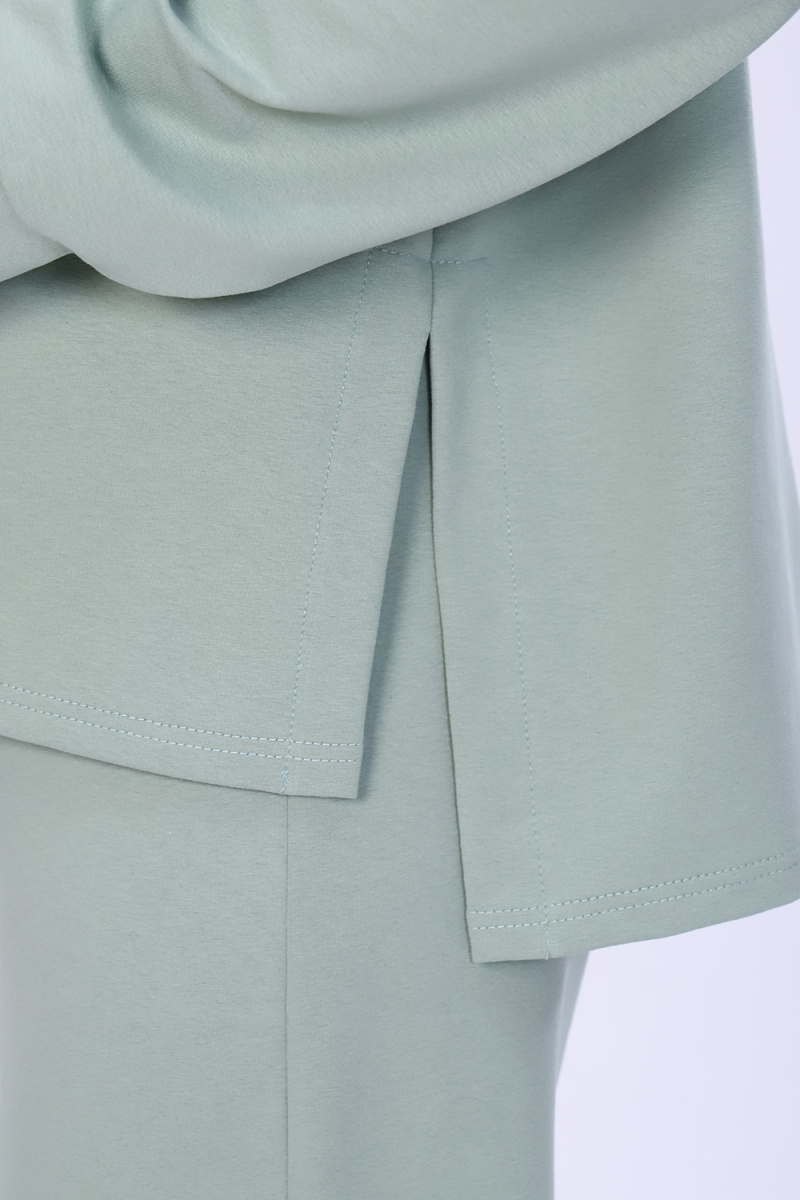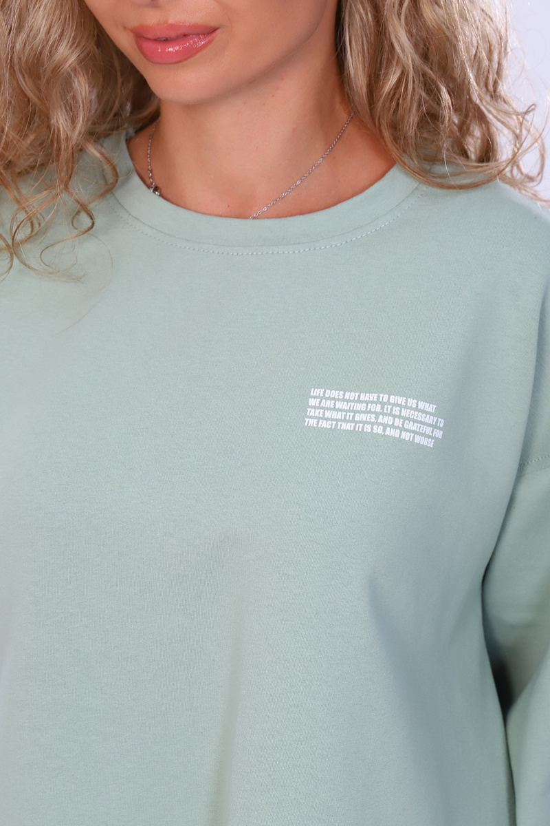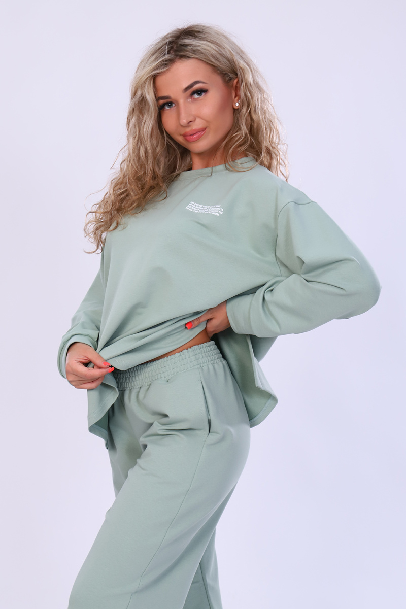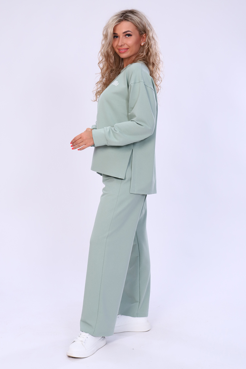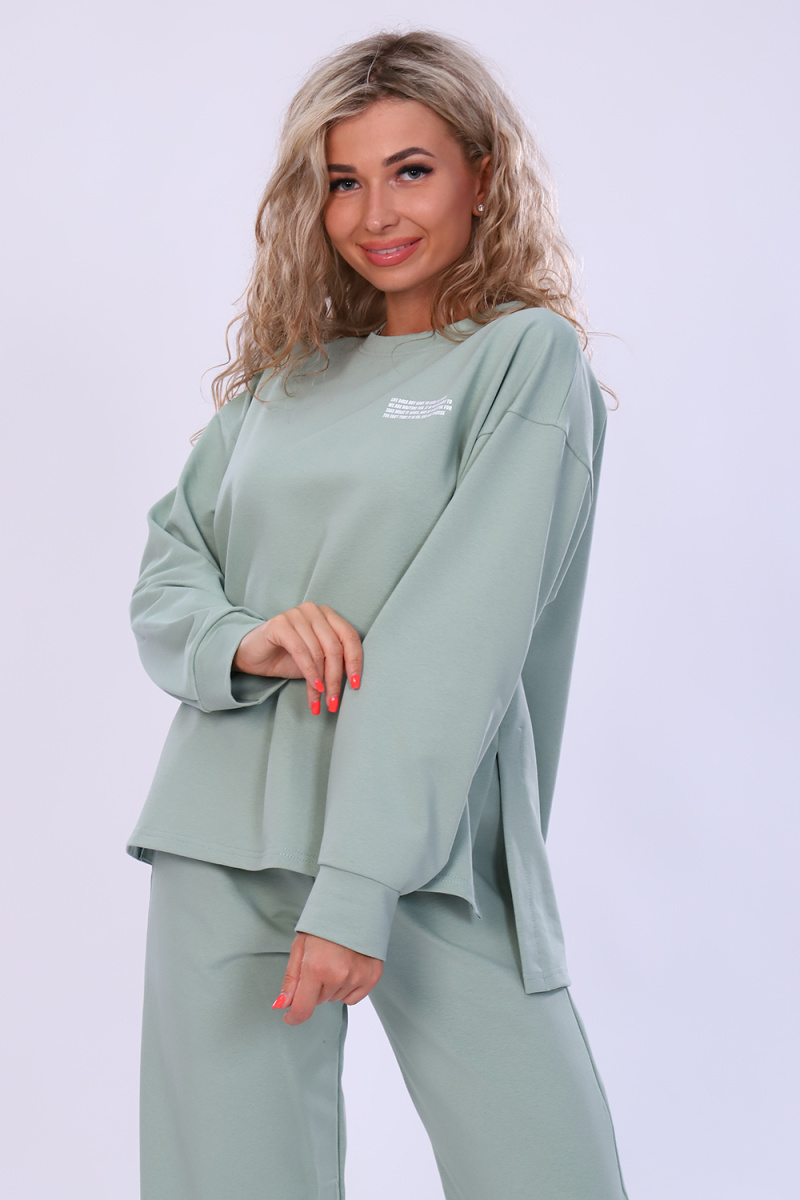 Модный женский костюмчик из плотной ткани. Брюки свободные с карманом, широкие внизу. Кофта свободная по боковым швам разрез. Спинка длиннее, что делает модель модной и стильной. Рукав длинный со складочками на манжете. На груди принт не броский, но придающий вид.