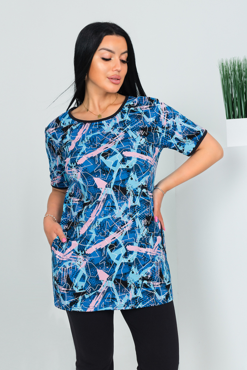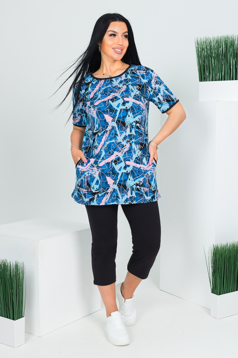 Костюм женский из кулирного трикотажного полотна состоит из туники и бридж. Туника полу прилегающего силуэта, слегка расширенная к низу, длиной до середины бедра. Рукава втачные короткие. Боковые карманы с окантованным входом. Горловина округлой формы и низ рукава окантованы отделочным полотном. Бриджи базовые, облегающие фигуру, длиной до середины икр. Верх с резинкой. Без карманов.