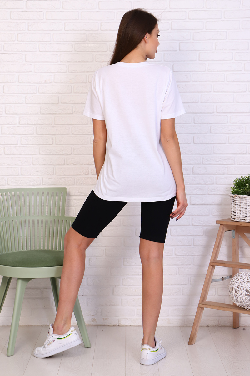 Молодежный костюм футболка и велосипедки. Футболка из кулирки 100% хлопок свободного кроя, стиль oversize, втачным коротким рукавом горловина округлой формы. На полочке изделия принт. Низ рукава и низ изделия подгибка. Велосипедки из кулирки с лайкрой облегающего силуэта без бокового шва. Низ изделия подгибка.