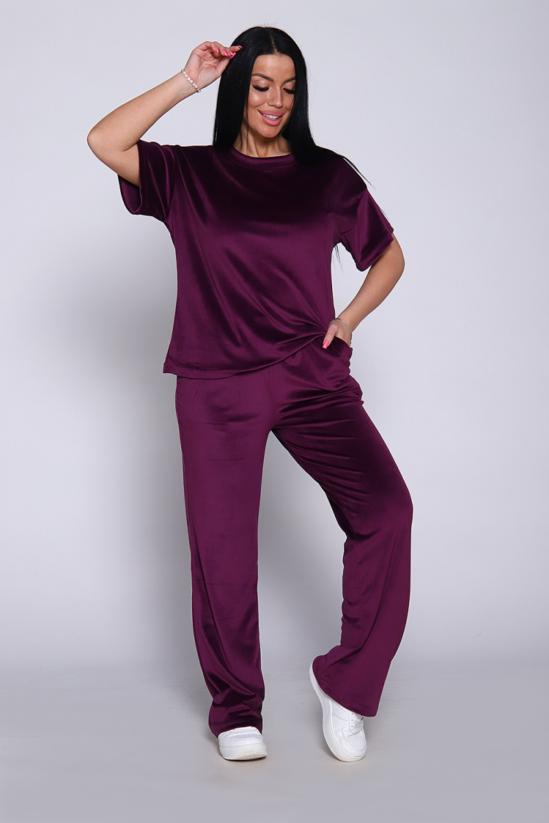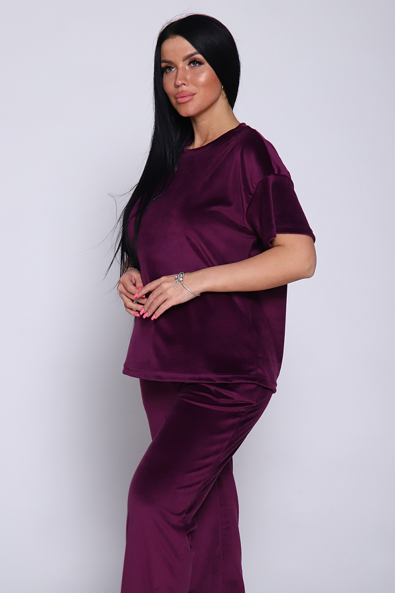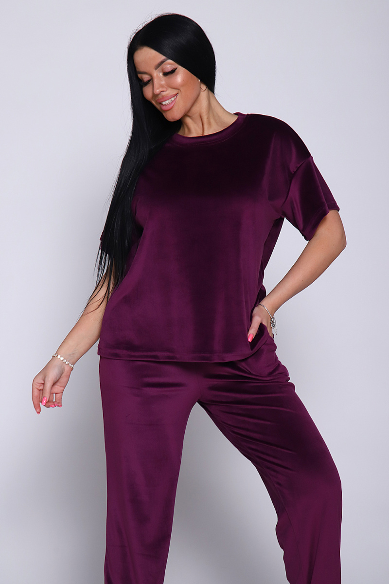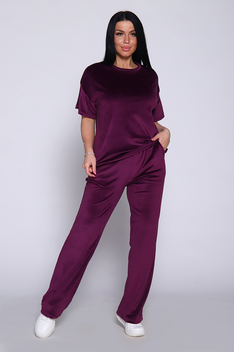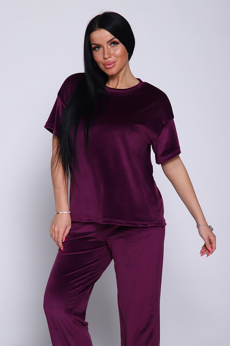 Костюм женский велюровый, повседневный, всесезонный. Костюм состоит из футболки и брюк. Футболка оверсайз прямого силуэта, длиной до бедра. Рукав втачной со спущенным плечом, длиной чуть выше локтя. Горловина с обтачкой, низ футболки с подгибкой. Брюки прямого силуэта, умеренного объема. На передних половинках брюк карманы с отрезным бочком. Пояс притачной с эластичной тесьмой. Низ брюк подгибка. Замеры объема талии брюк по нерастянутой резинке.