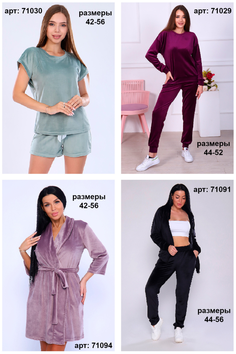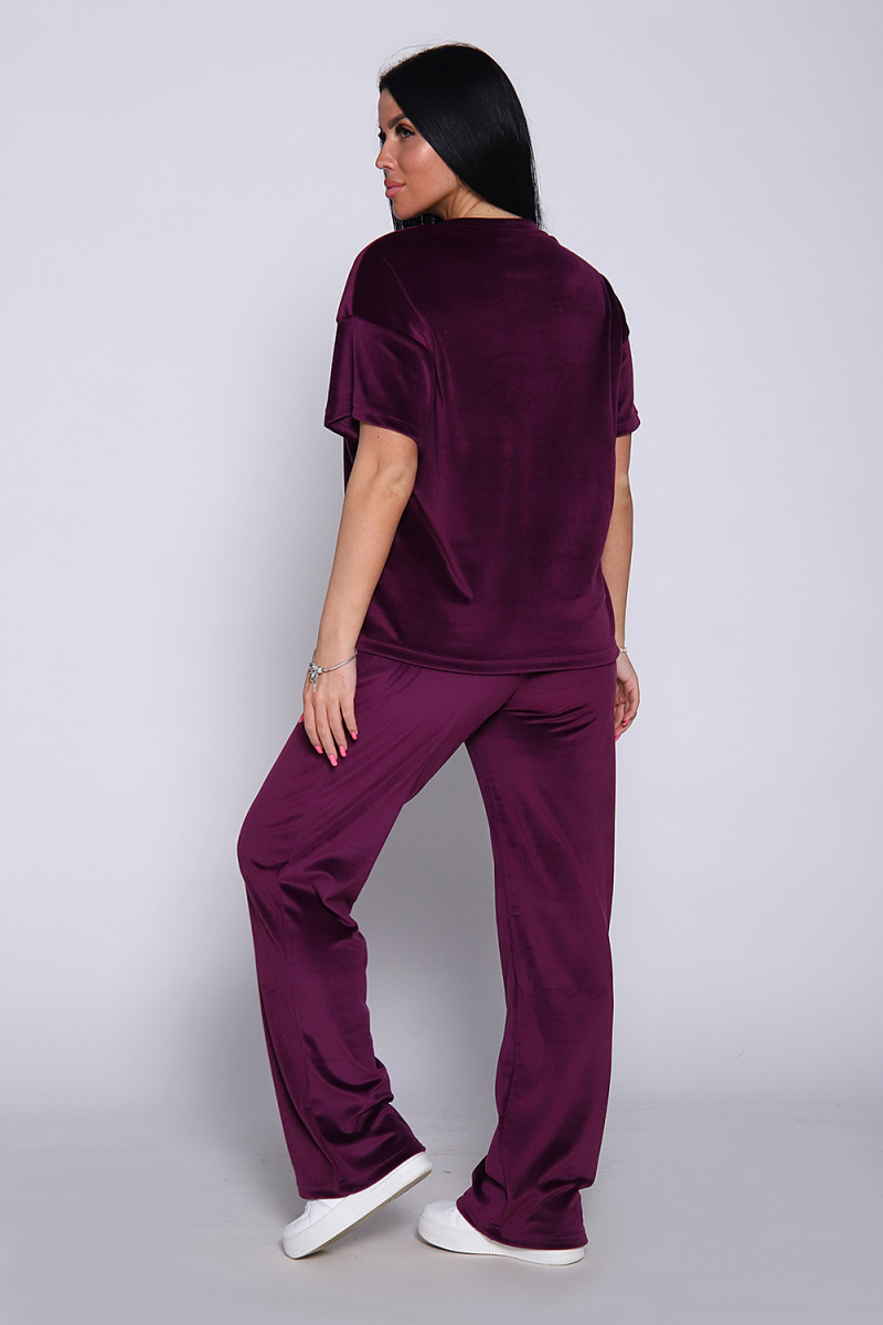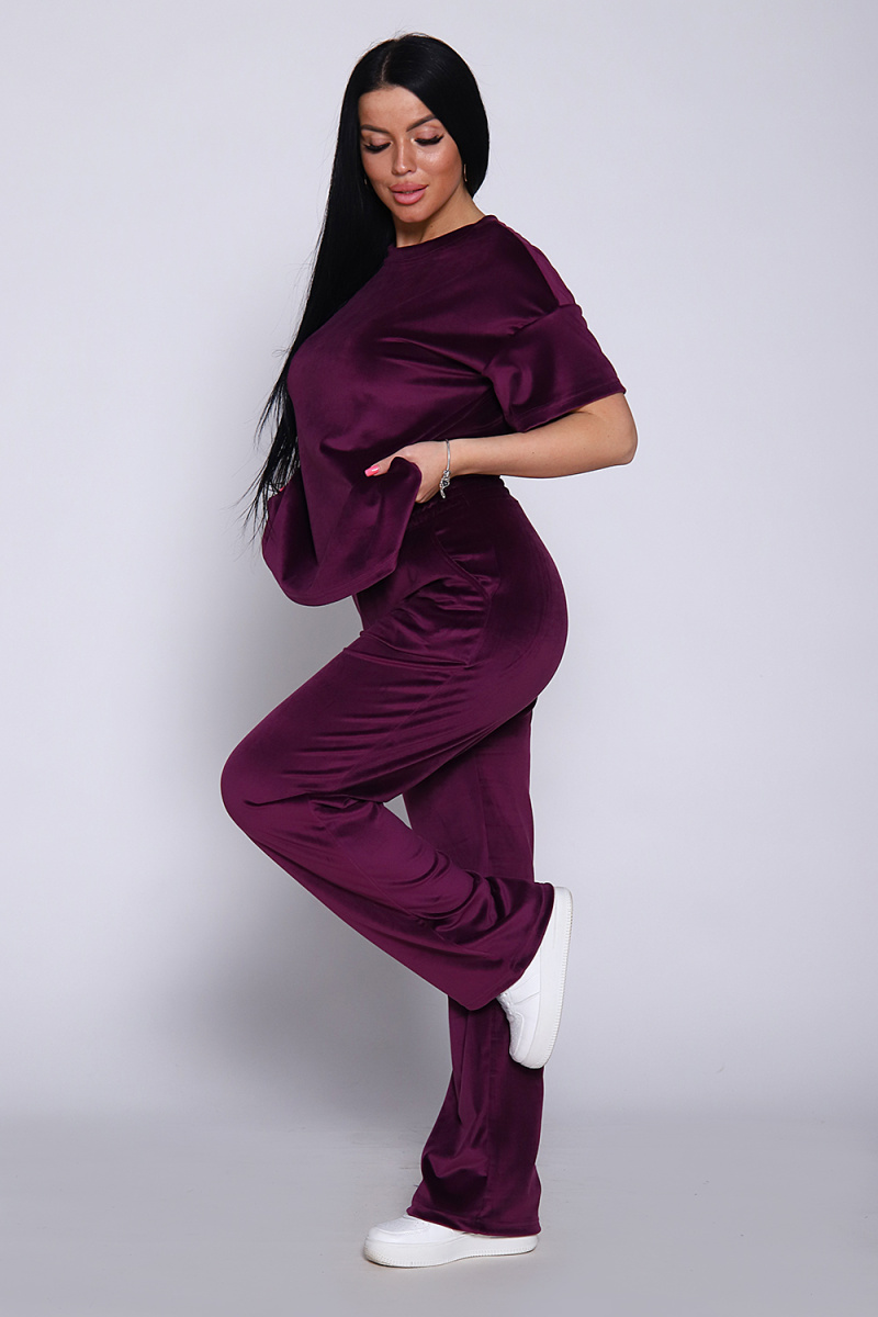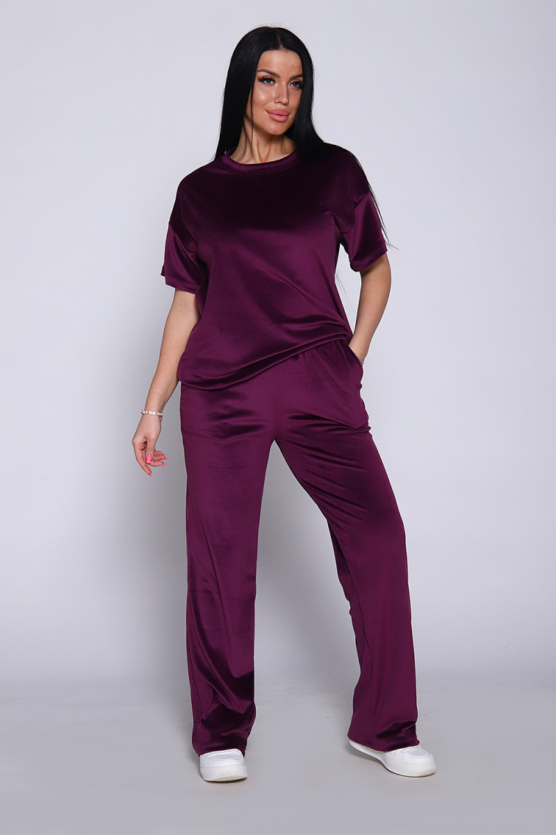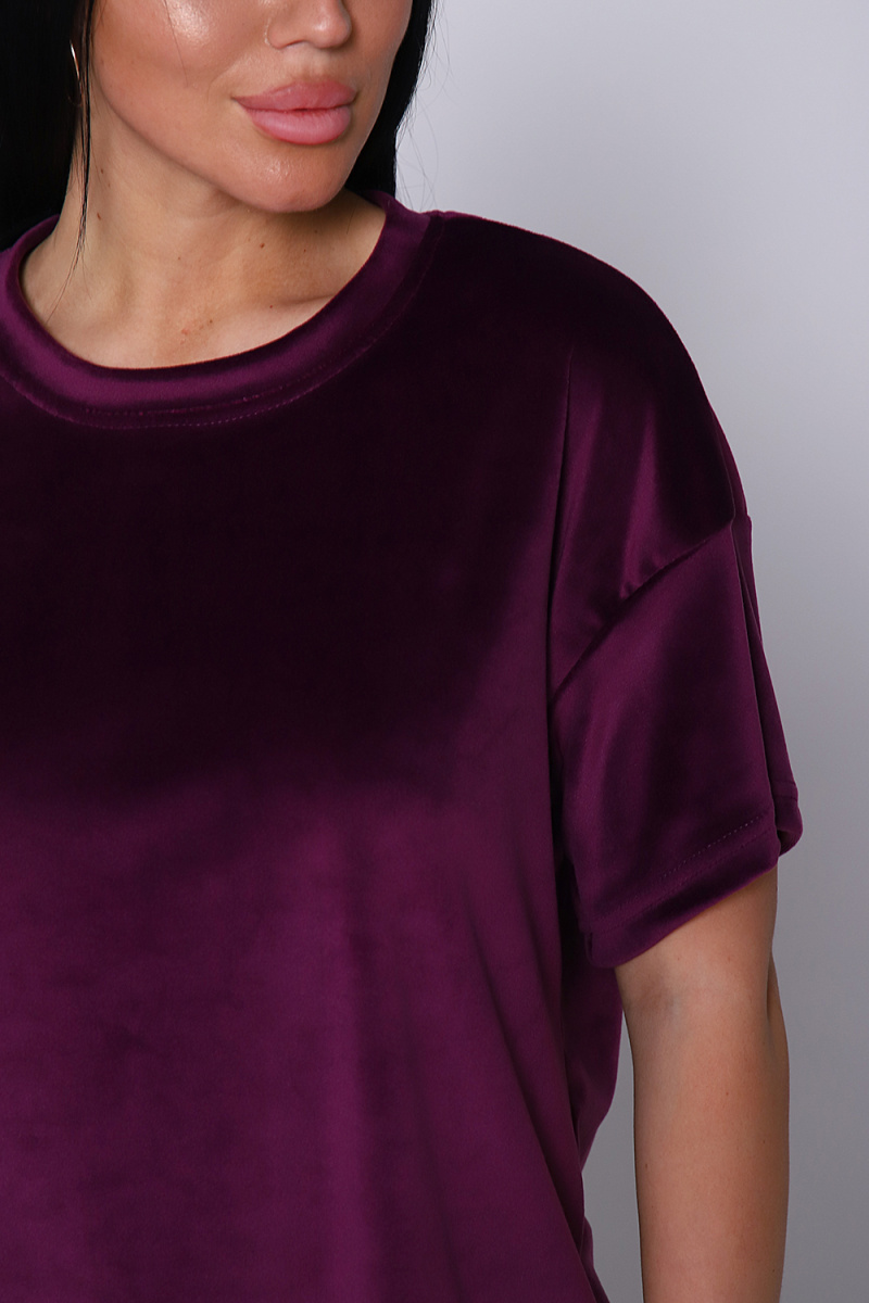 Костюм женский велюровый, повседневный, всесезонный. Костюм состоит из футболки и брюк. Футболка оверсайз прямого силуэта, длиной до бедра. Рукав втачной со спущенным плечом, длиной чуть выше локтя. Горловина с обтачкой, низ футболки с подгибкой. Брюки прямого силуэта, умеренного объема. На передних половинках брюк карманы с отрезным бочком. Пояс притачной с эластичной тесьмой. Низ брюк подгибка. Замеры объема талии брюк по нерастянутой резинке.