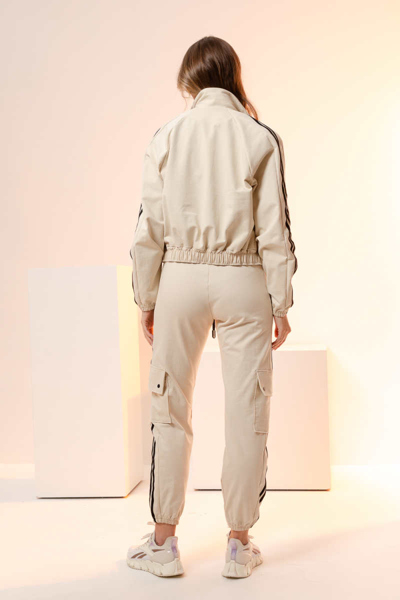 Крой ветровки укороченный, с воротником-стойка, по рукавам контрастные полоски. Брюки в стиле карго с полосками по бокам, высокой посадкой имеют прямой крой, брюки будут держать модную планку еще несколько сезонов. За счет своего удобства и комфорта этот фасон стремительно набирает популярность. Легкий комплект произведен с учетом большинства особенностей фигур. Исходя из этого, отлично подойдет как для худеньких девушек и подростков, так и для полных, как для высоких, так и для среднего роста женщин.